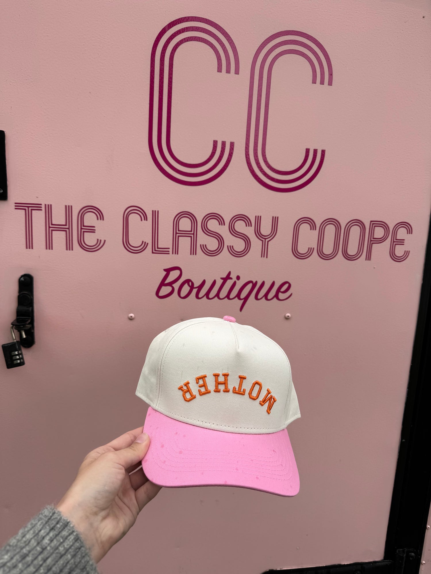 UPSIDE DOWN MOTHER TRUCKER HAT - ORANGE/PINK